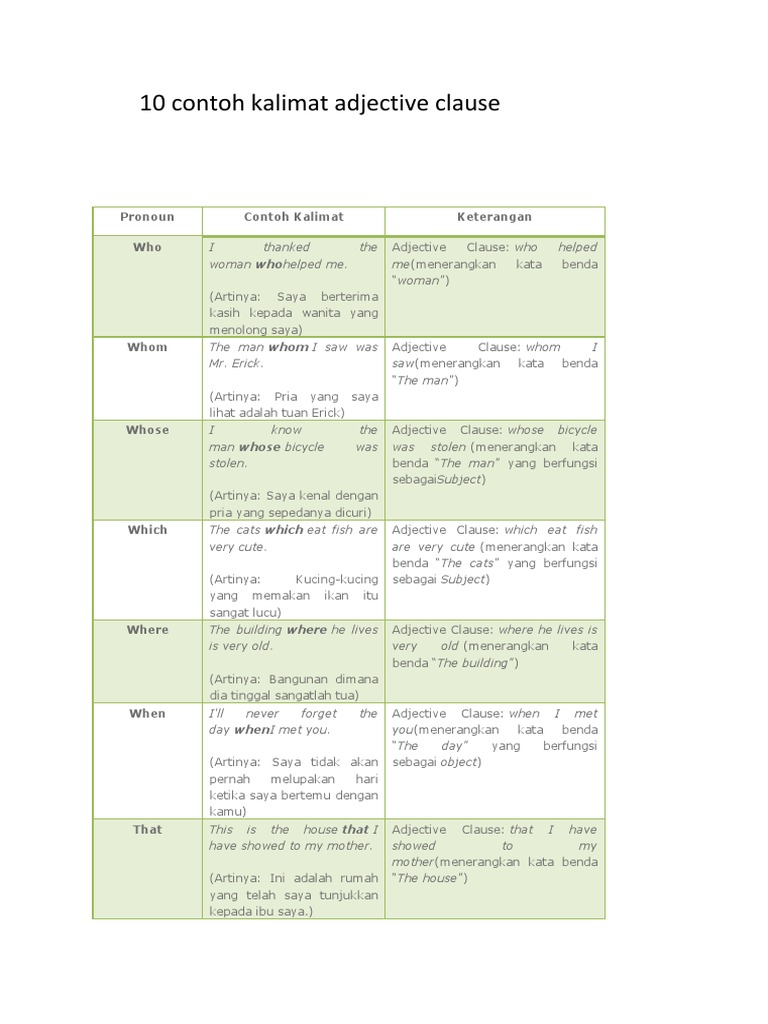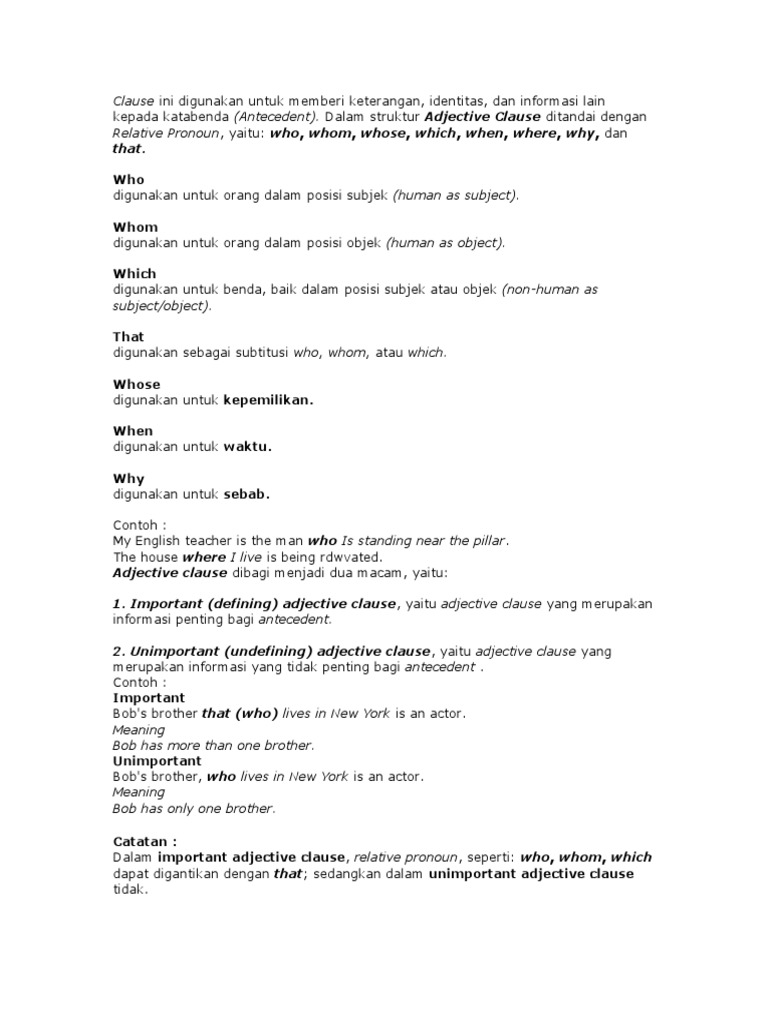 Kata whose sering kita jumpai dalam kalimat, tetapi rasanya sulit jika kita membuat kalimat sendiri. Relative clause secara sederhana kita artikan adalah suatu clause yang menggunakan relative pronouns. The bedroom itself is fine, but the bathroom is cramped. Adi adalah subyek yang ditanyakan. Bagaiamana arti who, whom, dan whose dalam bahasa indonesia? Salah satu contohnya adalah who, whom, whose yang. Relative pronoun merupakan kata ganti yang digunakan untuk menghubungkan dua kalimat dan menerangkan kata benda. Bahasa mudahnya, arti siapa untuk whom merujuk pada kata untuk menanyakan objek. Kata ini sering muncul dalam kalimat bahasa inggris. Pronoun adalah kata yang digunakan untuk menggantikan noun yang dapat berupa orang, benda, hewan contoh kalimat interrogative pronoun: Simak contoh kalimat kata sifat dalam bahasa inggris. Relative pronoun adalah digunakan untuk menggabungkan dua kalimat yaitu induk kalimat dan anak kalimat menjadi satu kalimat yang sama subjeknya ataupun objeknya. Perhatikan kata he yang diblok pada kalimat di atas, dimana kata tersebut kita gantikan dengan relative pronouns who.